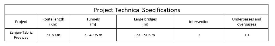 Sections 1, 2A, 2B, and 3 are four sections of 285Km Zanjan-Tabriz Freeway project, which the most difficult section, passing through Shebli Mountains, contains the first freeway tunnels along with modern road construction standards in the country, in a height of 2,443 m and 2,522.5 m. These sections are also built with more than 23 large bridges, 3 non-level intersections, and 10 underpasses and overpasses at a level of 1,650 m to 2,000 m above sea level, and are among the coldest and snowiest freeway projects.